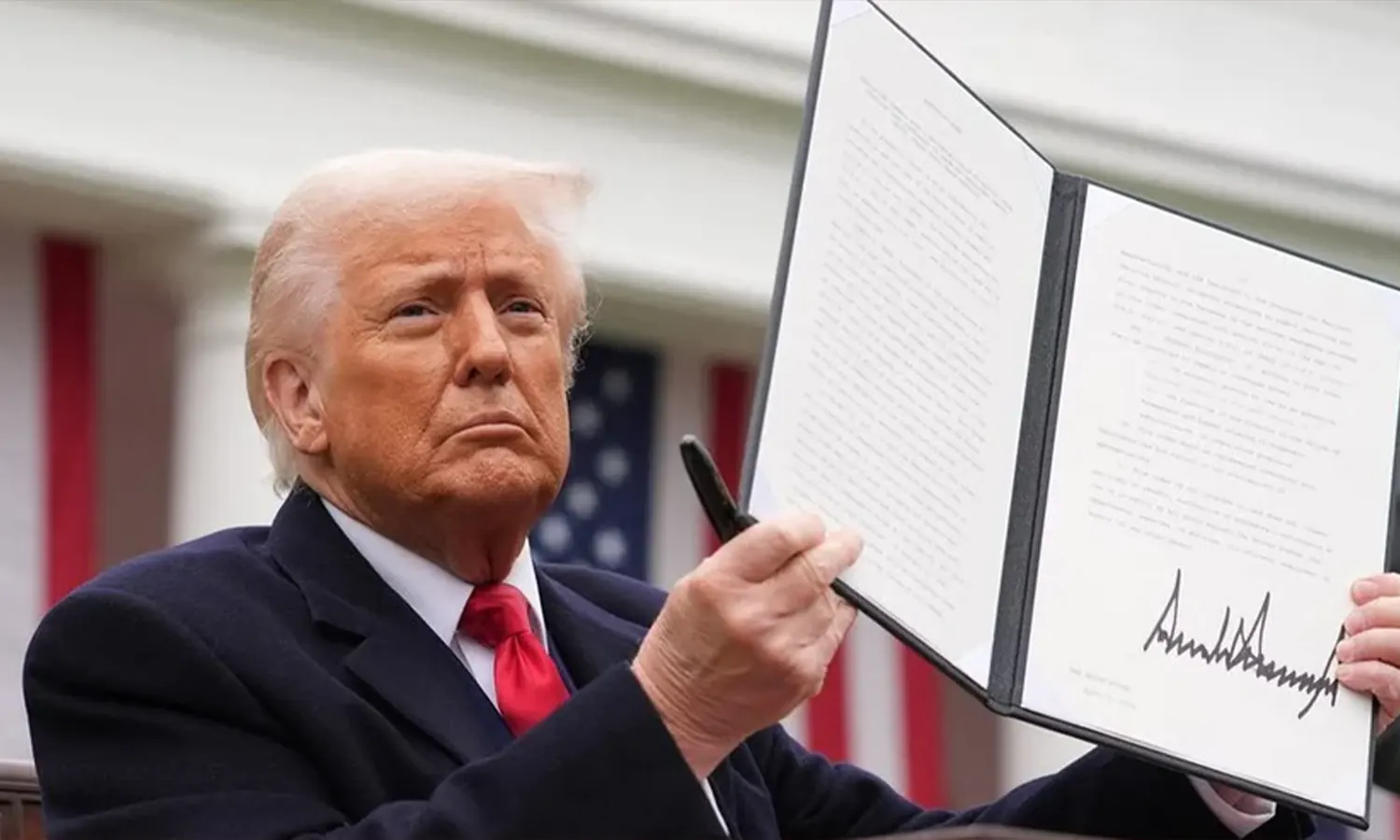 Presiden AS Donald Trump menunjukkan perintah eksekutif yang ditandatangani yang memberlakukan tarif pada barang impor selama acara pengumuman perdagangan "Make America Wealthy Again" di Rose Garden di Gedung Putih.(Foto: Dok.AFP)