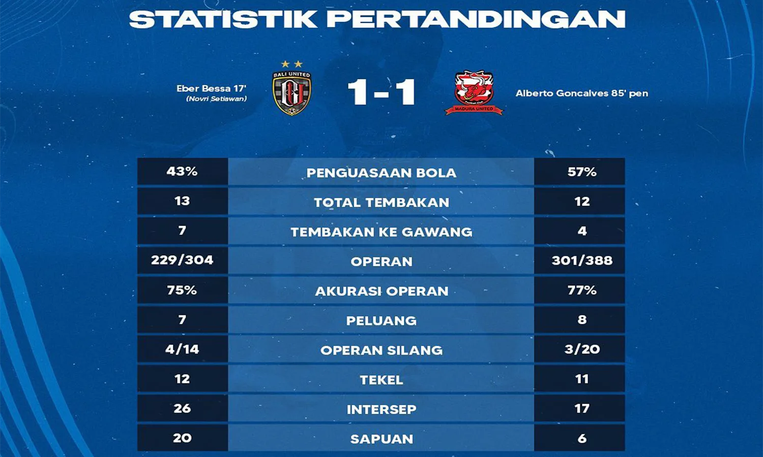 Namun, Madura United berhasil menyamakan kedudukan pada menit ke-85 melalui gol dari eksekutor penalti, Beto Goncalves.
