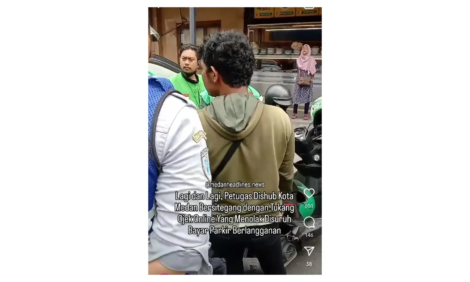 Tangkapan layar video viral petugas Dinas Perhubungan yang meminta pengemudi ojek online membayar parkir berlangganan. (Foto: Instagram @medan.headline.news)