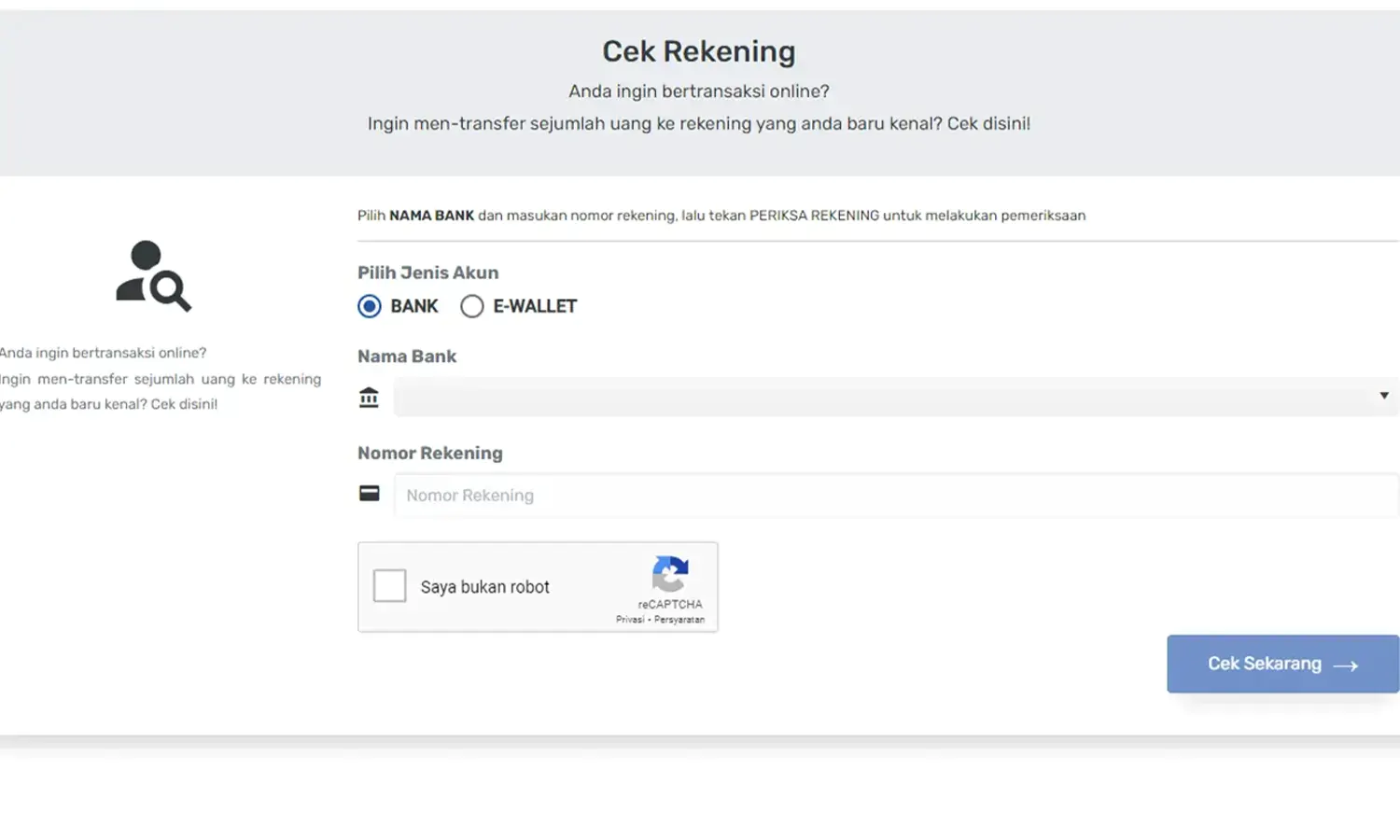- Pilih jenis bank, seperti BCA, BNI, BRI, Mandiri, atau bank lainnya, dan masukkan nomor rekening bank atau nomor e-wallet yang ingin kamu periksa.