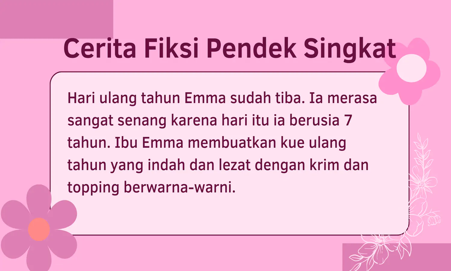 Hari ulang tahun Emma sudah tiba. Ia merasa sangat senang karena hari itu ia berusia 7 tahun. Ibu Emma membuatkan kue ulang tahun yang indah dan lezat dengan krim dan topping berwarna-warni.