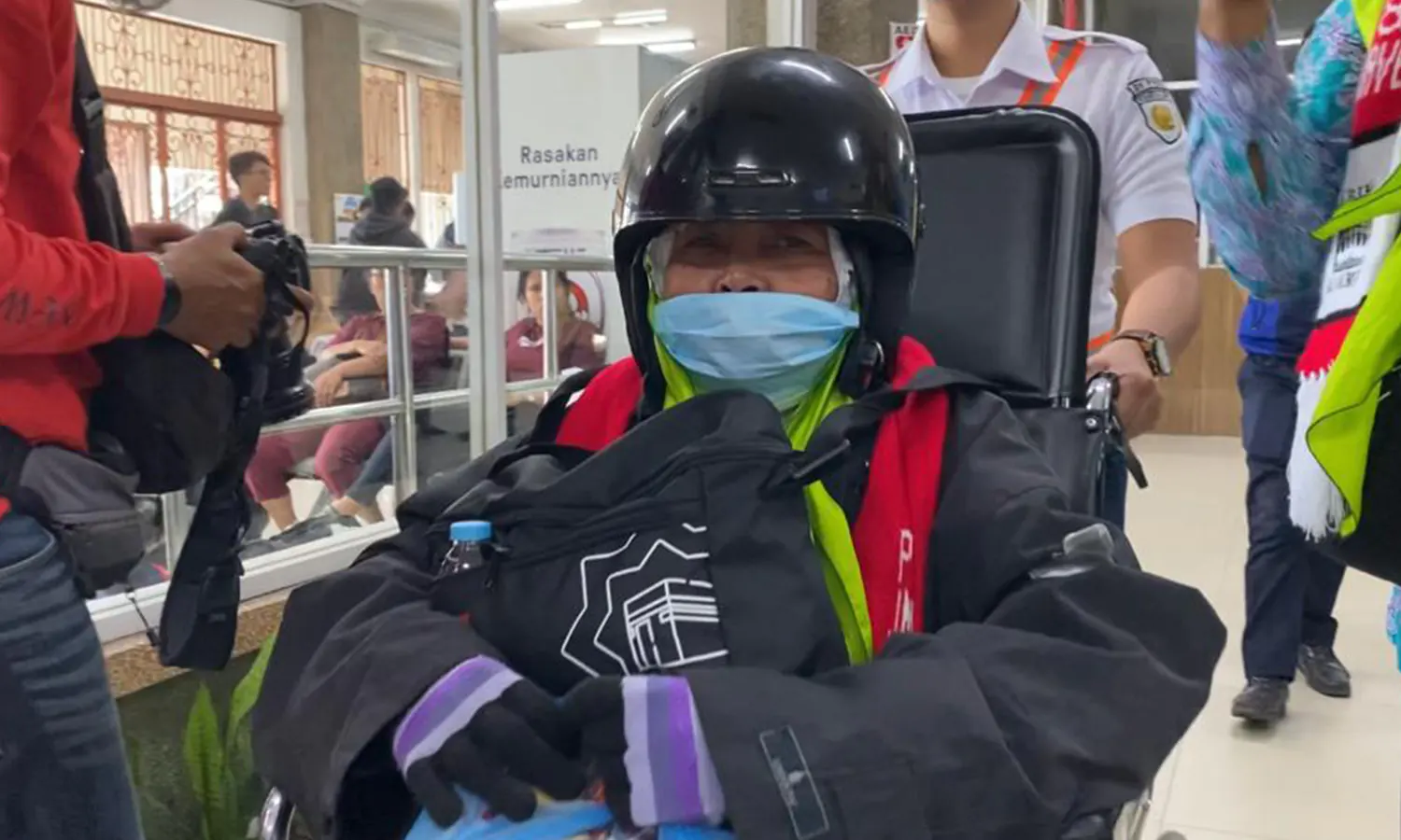 Perempuan berusia 68 tahun ini terlihat duduk di kursi rodal menggunakan seragam yang dilapisi jaket hitam.