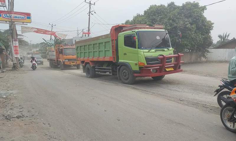 Kepulan debu membubung di Jalan Raya Sudamanik. (Foto: Parboaboa/Hari Setiawan)