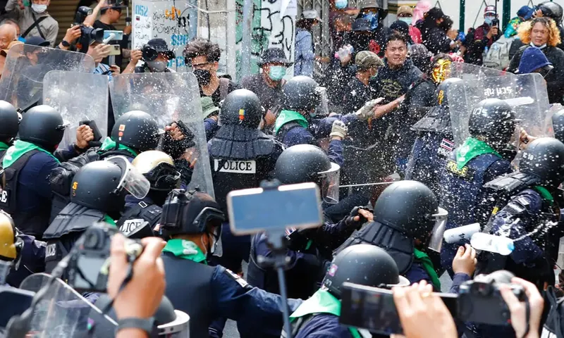 Para pengunjuk rasa melemparkan proyektil dan menyerang polisi anti huru hara, yang maju ke arah mereka dengan tameng dan pentungan. (Foto: AP)