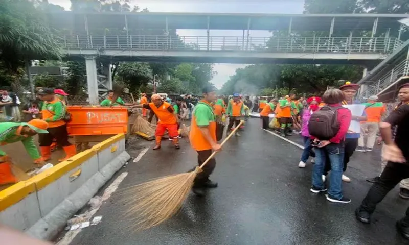 Petugas kebersihan bersihkan sampah sisa demo BBM di kawasan Patung Kuda, Jakarta (Foto: okezone.com/Irfan Maulana)