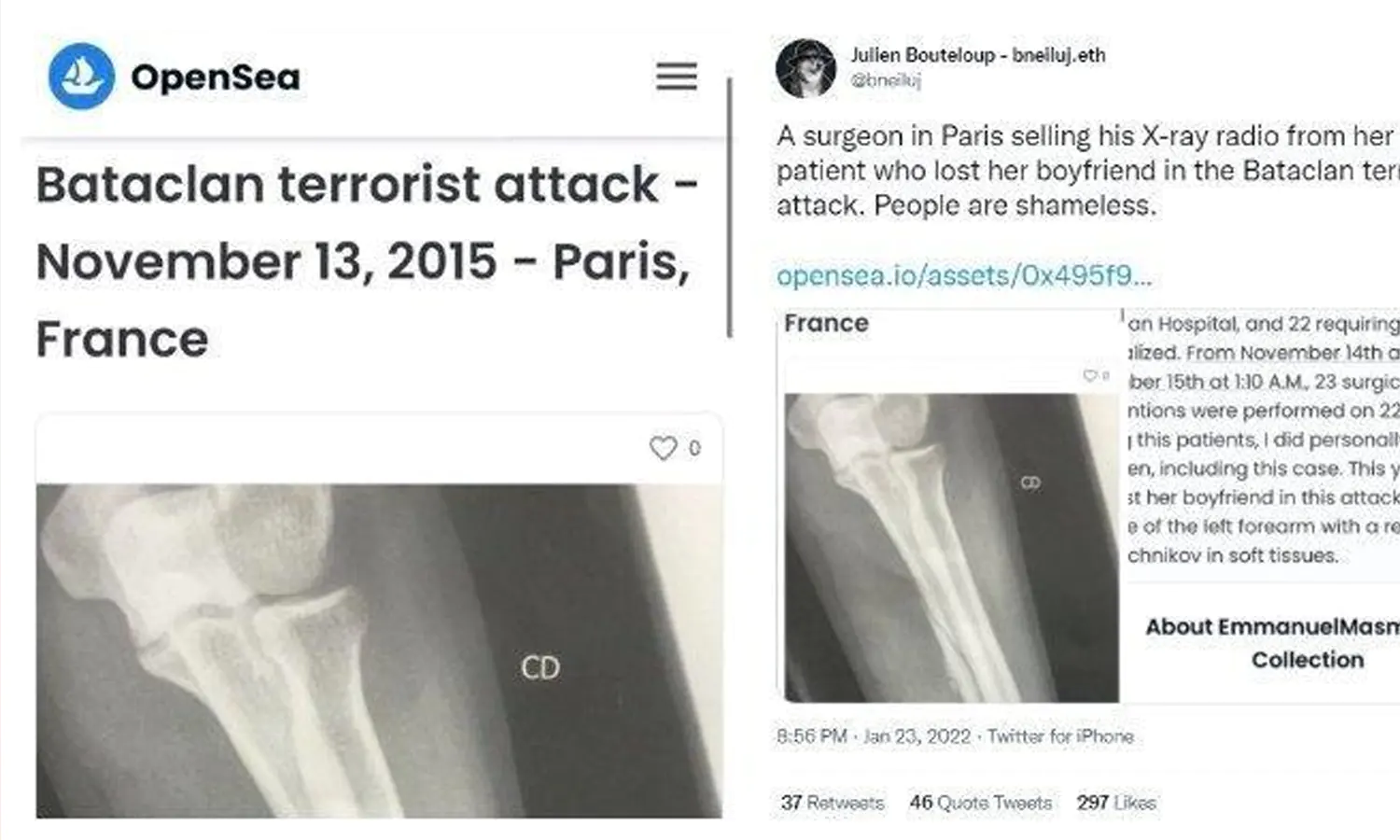 Namun, berdasarkan laman arsip web (web archive), NFT X-Ray pasien tersebut dijual oleh dengan judul "Bataclan terrorist attack - November 13, 2015 - Paris, France".