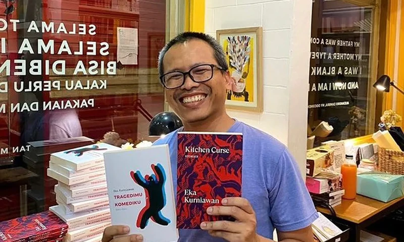 Eka Kurniawan saat peluncuran karyanya, Kitchen Curse dan Tragedimu Komediku. (Foto: Instagram/@gnolbo)