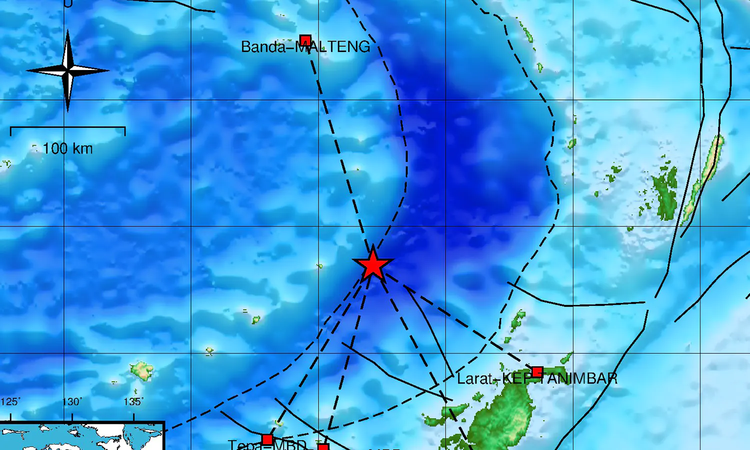 Gambar Peta Wilayah Tanimbar dan Sekitarnya Yang Terkan Gempa. (Foto: X/@infoBMKGMaluku)