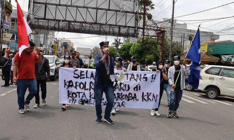 Ratusan mahasiswa dari Gerakan Mahasiswa Kristen Indonesia (GMKI) menuntut Kejaksaan Negeri (Kejari) mengusut tuntas berbagai dugaan kasus korupsi di pemerintahan Kota Pematang Siantar, Sumatra Utara. (Foto: PARBOABOA/Calvin Siboro)