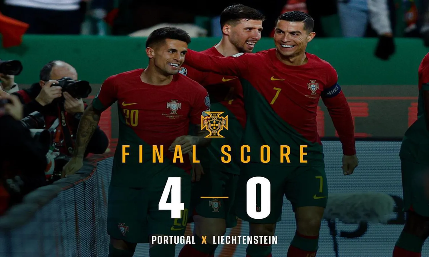 Timnas Portugal menunjukkan dominasinya saat menghadapi Liechtenstein pada pertandingan matchday 1 Grup J Kualifikasi Euro 2024 di Estadio Jose Alvalade, Jumat (24/3/2023). Skuad asuhan Roberto Martinez berhasil mengalahkan tamunya dengan skor telak 4-0.
