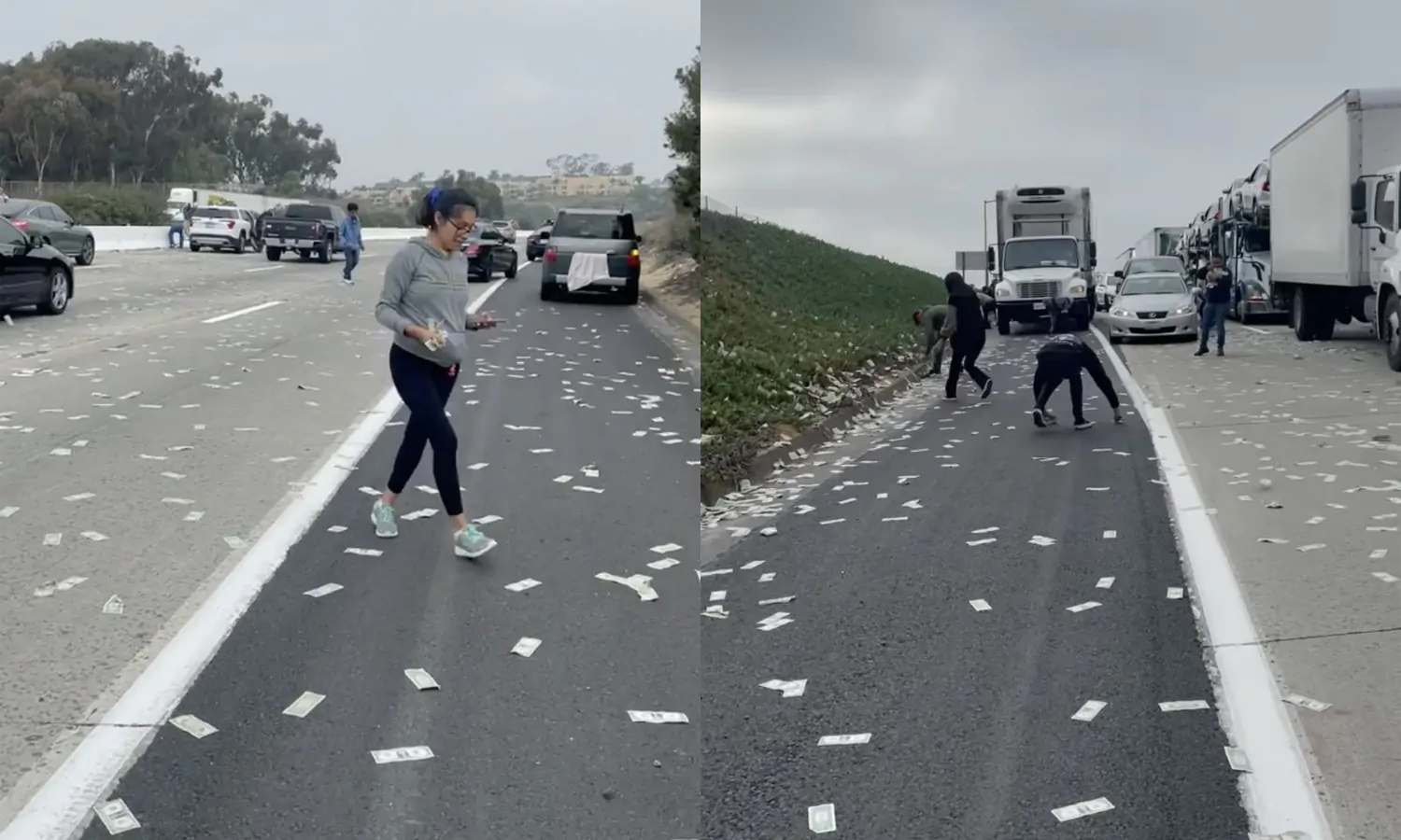 Melihat uang berserakan, sejumlah pemudi menepikan kendaraan dan berhenti untuk memungut uang-uang itu. Jalur Interstate 5 dekat Cannon Road menjadi padat dan akhirnya ditutup mulai pukul 9.15 waktu setempat.