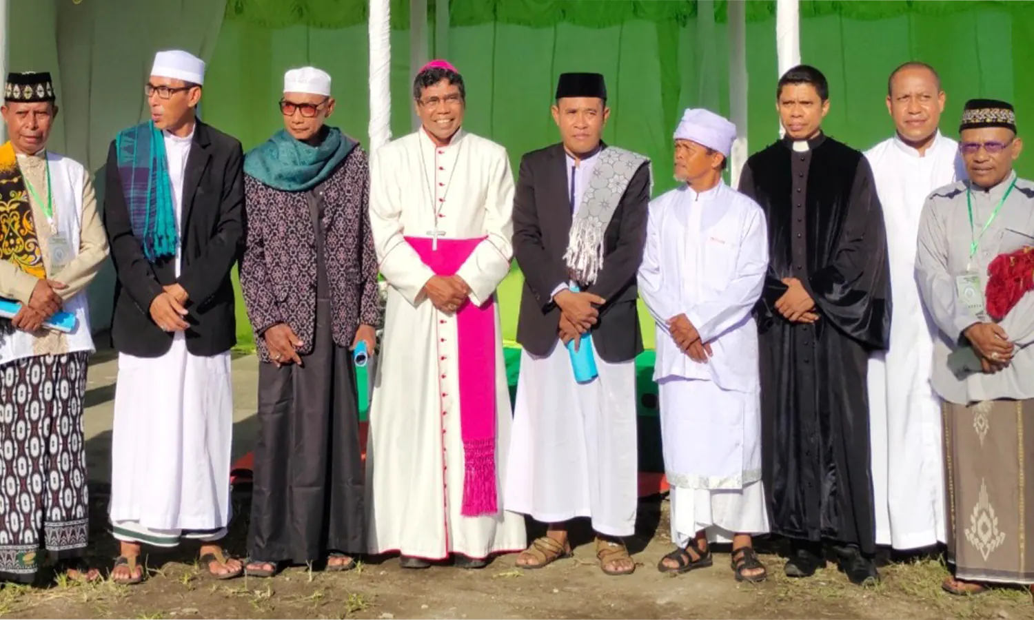 Uskup Paulus Budi Kleden (mengenakan topi ungu kemerahan) diapit para pemuka agama Islam setelah Shalat Ied di Lapangan Pancasila Ende (Foto: FB/@Komsos Keuskupan Agung Ende)