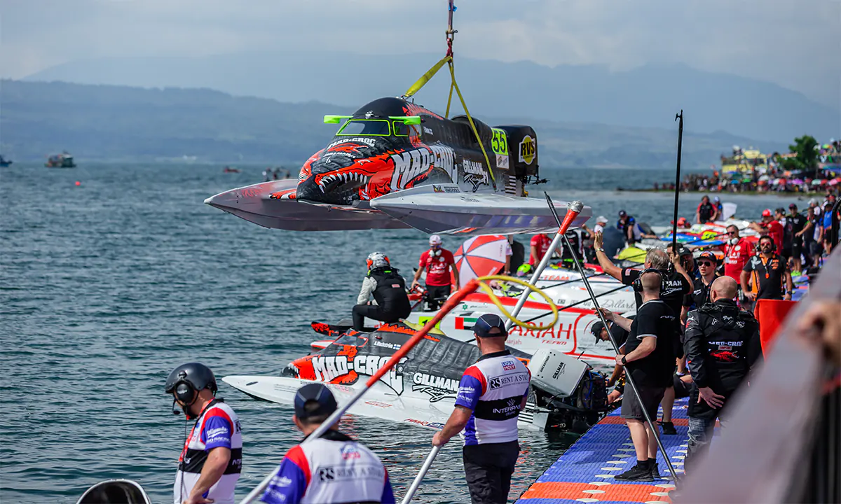 Perahu Motor (Powerboat) milik Fillip Roms dari tim Gillman Racing sedang diturunkan untuk memasuki area lintasan Powerboat F1H2O di Danau Toba, Balige. (Foto: PARBOABOA)