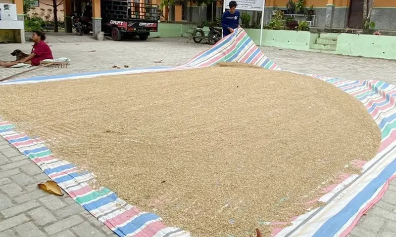 Petani sedang menjemur padi di sebuah lapangan sekolah di Kota Pematang Siantar, Sumatra Utara. (Foto: PARBOABOA/Calvin Siboro)