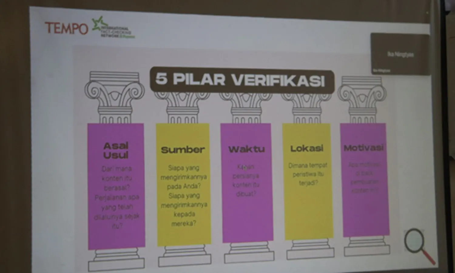 Ika turut memaparkan lima pilar verifikasi sebagai dasar yang tak terpisahkan dari kerja jurnalistik. Kelima pilar ini bukan sekadar alat teknis, namun ia juga merupakan prinsip yang menuntun jurnalis untuk tetap berpijak pada akurasi.