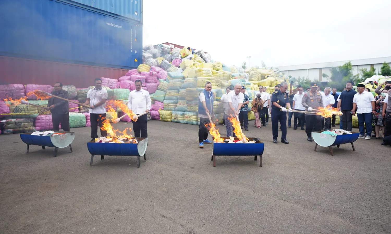 PARBOABOA, Jakarta - Kementerian Perdagangan melakukan pemusnahan 7.363 bal pakaian bekas hasil operasi penegakan hukum oleh Bareskrim Polri dan Ditjen Bea Cukai Kemenkeu di gudang Pasar Senen dan Pasar Kramat Jakarta Pusat, serta gudang di Tarumajaya Kabupaten Bekasi, senilai Rp80 miliar di Cikarang, Kabupaten Bekasi, Jawa Barat pada Selasa (28/3/2023).