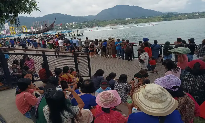 Masyarakat menyaksikan para pembalap yang tengah menjajal trek Danau Toba di pagar dari arena tribun venue utama yang terletak di Pelabuhan Mulia Raja Napitupulu Balige. (Foto: PARBOABOA/Putra Purba)