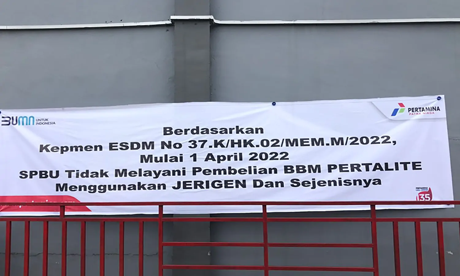 Pjs. Corporate Secretary PT Pertamina Patra Niaga, Sub Holding Commersial & Trading PT Pertamina, Irto Ginting mengatakan, pembelian BBM jenis Pertalite memakai Jerigen telah dilarang karena Pertalite kini sudah menjadi Jenis BBM Khusus Penugasan (JBKP).