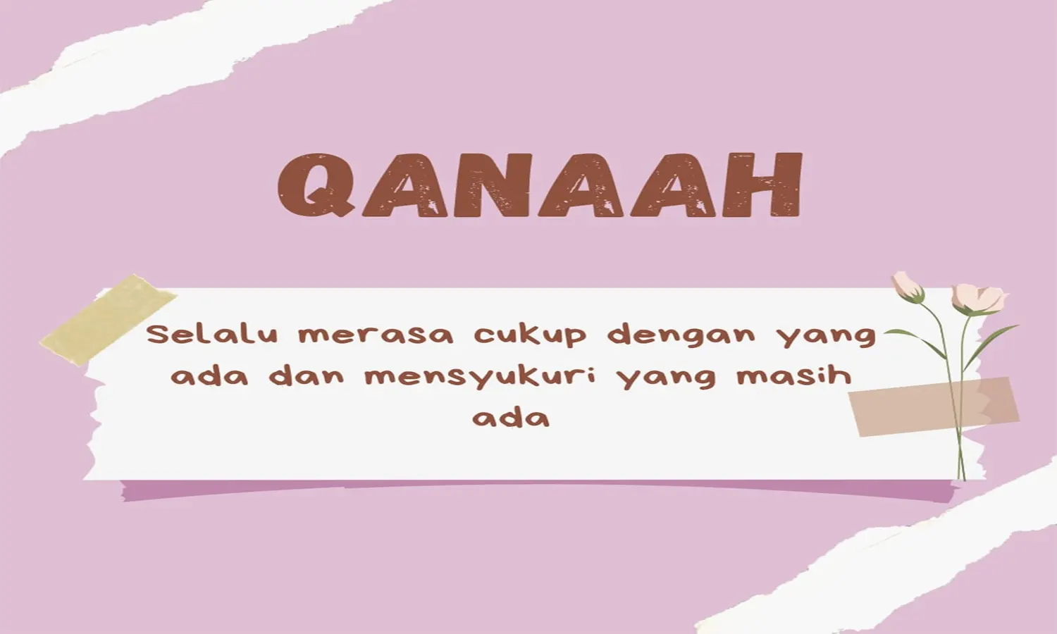 Dapat diartikan pula bahwa qanaah merasa cukup terhadap pemberian rezeki dari Allah. Dengan menanamkan sikap ini maka jiwa akan terasa tentram dan terjauh dari sifat serakah atau tamak.
