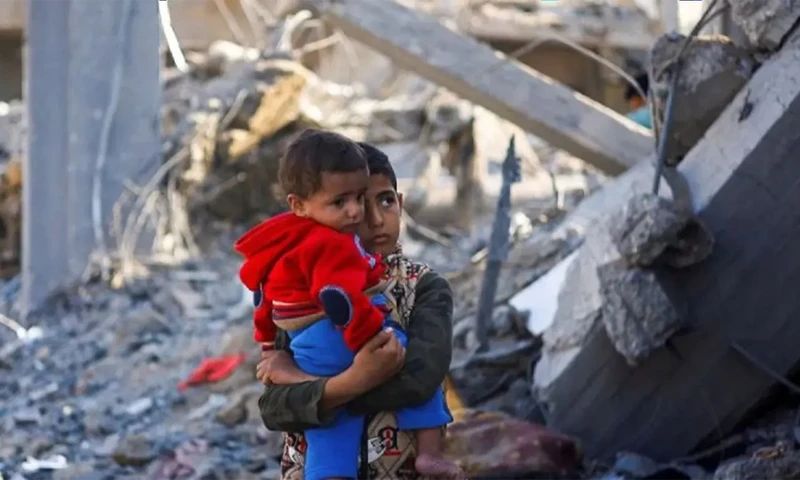 Seorang anak laki-laki Palestina sambil menggendong balita berdiri di lokasi serangan Israel saat konflik yang sedang berlangsung antara Israel dan kelompok perlawanan Palestina Hamas di Rafah, di selatan Jalur Gaza, Senin (4/12/2023).(Foto: Dok. Antara)