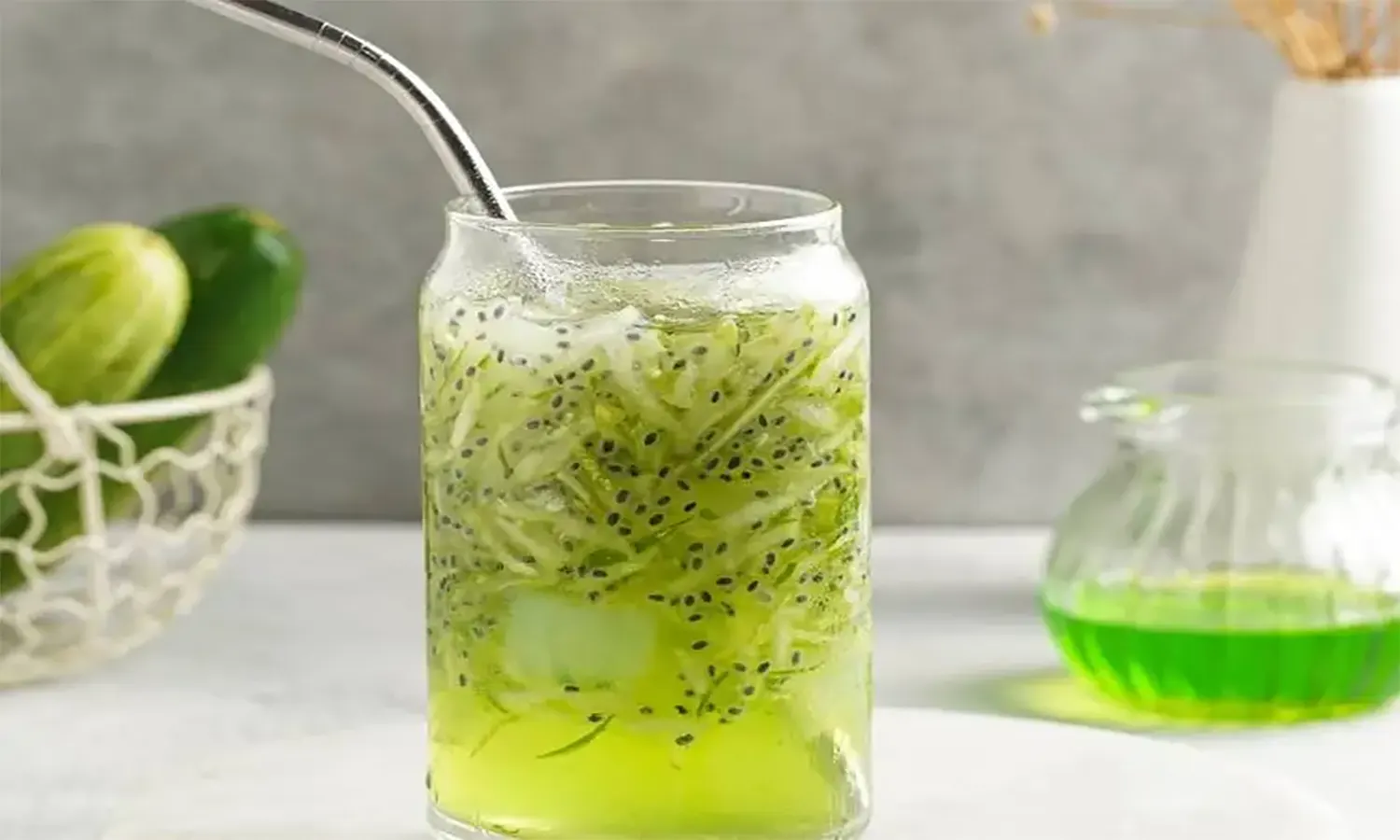2. Campur timun serut dengan air jeruk nipis, sirup melon, dan air matang. Aduk rata.