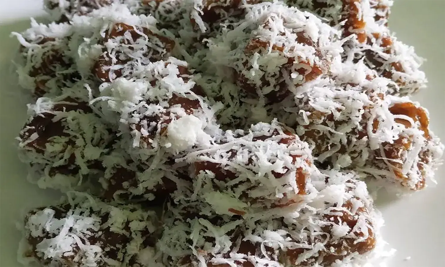 6. Baluri potongan kue dengan kelapa parut hingga rata.