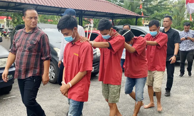 Empat anggota sindikat perampok nasabah bank antar provinsi yang beroperasi sejak 2015, digiring petugas ke sel tahanan Polda Sumatra Utara. (Foto: PARBOABOA/Ilham Pradilla)