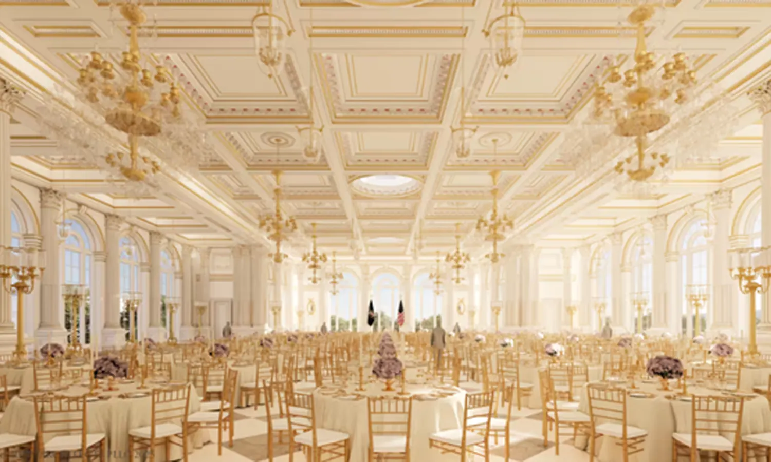 Gedung Putih telah merilis rancangan interior ballroom raksasa yang akan dilengkapi dengan tiang-tiang klasik dan lampu gantung emas yang mewah.
