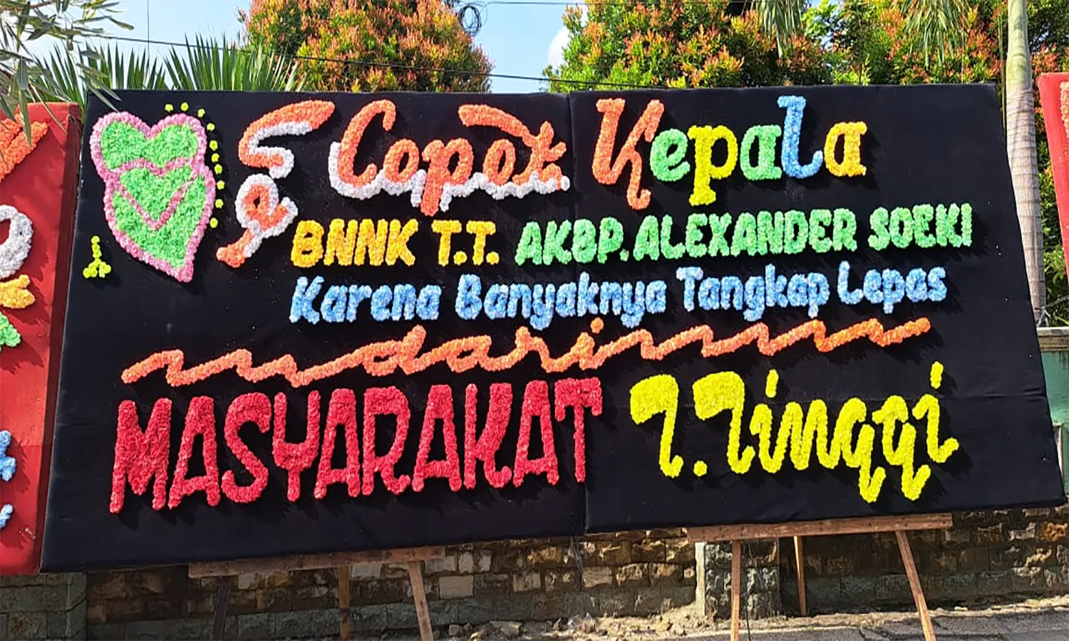 Papan bunga tersebut dikirim oleh anonim yang ditujukan untuk Badan Narkotika Nasional (BNN) dan Kepala Kepolisian Resor Tebing Tinggi, sejak Senin (20/03/2023). Isi kalimatnya "Selamat berduka, atas banyaknya tangkapan lepas BNNK T. Tinggi selama AKBP Alexander Soeki menjabat," tulis pengkritik.
